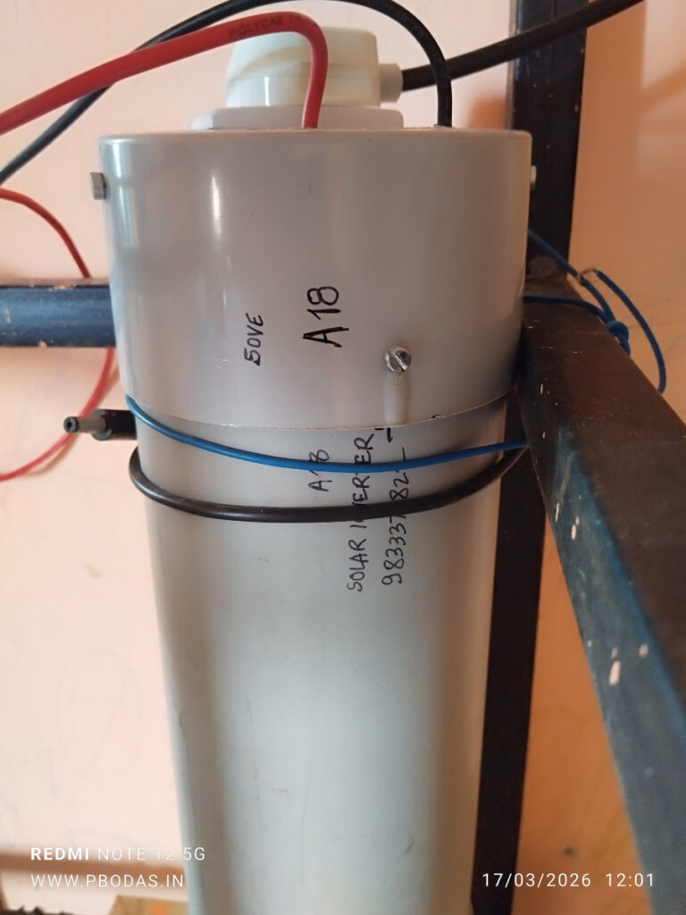 या चित्रात दिसणारी बॅटरी केवळ टेस्टींग/चाचणी साठी वापरली आहे. इन्स्टॉलेशनच्या ठिकाणी हे उपकरण थेट 36VDC सोलर पॅनल सोबत जोडायचे असते.